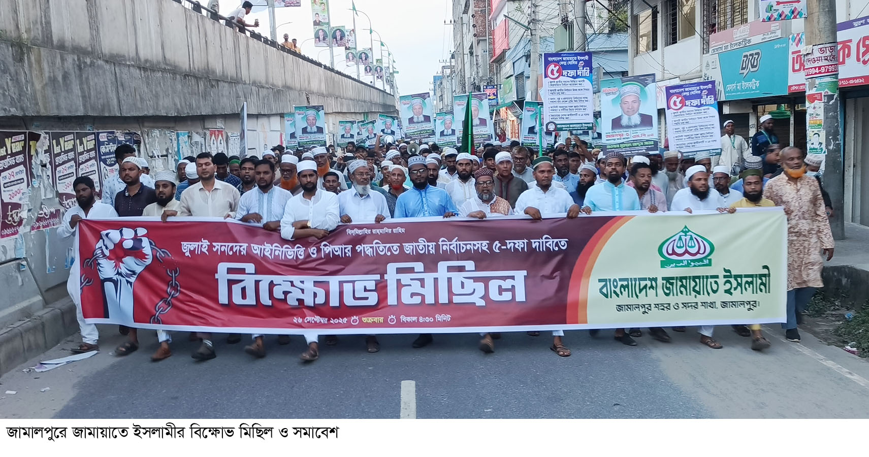 জামালপুরে জুলাই সনদের আইনিভিত্তি ও পিআর পদ্ধতিতে জাতীয় নির্বাচনসহ পাঁচ দফা দাবিতে বিক্ষোভ মিছিল ও সমাবেশ অনুষ্ঠিত হয়েছে। শুক্রবার ২৬ সেপ্টেম্বের বিকালে, বাংলাদেশ জামায়াতে ইসলামী জামালপুর শহর ও সদর উপজেলা শাখা এই বিক্ষোভ মিছিল ও সমাবেশের আয়োজন করে।