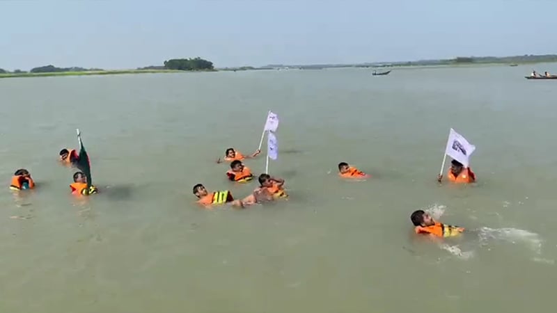 সেতুর দাবিতে লংমার্চ, তেঁতুলিয়া নদী সাঁতরে পাড়ি দিলেন ২০ শিক্ষার্থী