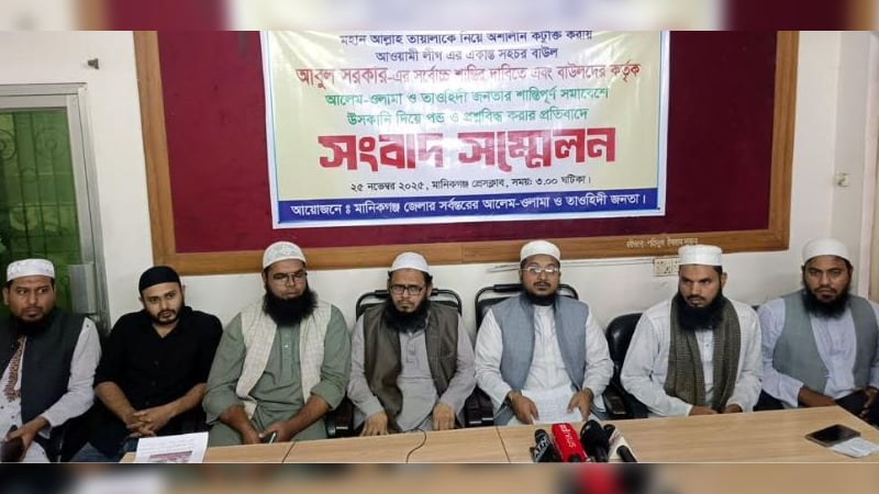 আজ মঙ্গলবার মানিকগঞ্জ প্রেস ক্লাব মিলনায়তনে এক সংবাদ সম্মেলনে এসব কথা বলেন তারা। আবুল সরকারের সর্বোচ্চ শাস্তির দাবিতে এবং বাউলদের কর্তৃক আলেম-ওলামা তৌহিদী জনতার শান্তিপূর্ণ সমাবেশে উসকানি দিয়ে পণ্ড করার প্রতিবাদে এই সংবাদ সম্মেলন আয়োজন করা হয়। ‘মানিকগঞ্জ জেলার সর্বস্তরের আলেম-ওলামা ও তৌহিদী জনতার ব্যানারে সংবাদ সম্মেলন আয়োজন করা হলেও এতে উপস্থিত সবাই হেফাজতে ইসলামের নেতা।